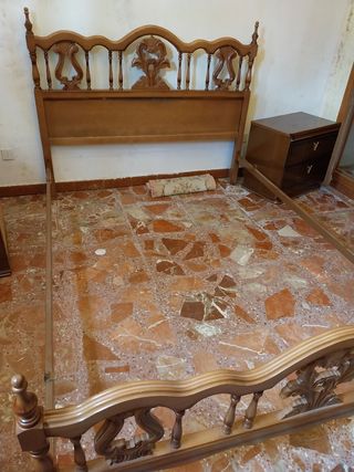 Cabecero y estructura de cama de madera. - Cabecero de madera con detalles ornamentales. - Estructura de cama robusta, también de madera. - Tapiflex de Pikolin, que sustituyó recientemente al somier de muelles antiguo. - Opcional y en mi perfil: colchón Pikolin de 135 en perfecto estado y recientemente comprado, a la vez que el tapiflex.