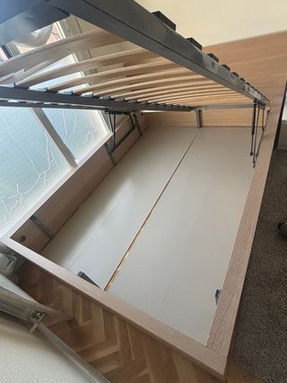 Cama nido de banak de 90x190 + dos colchones. El colchon inferior a estrenar y el superior en muy contadas ocasiones con alguna visita. Se compró todo en mayo de 2023, por lo que tiene menos de 3 años. Las 2 camas se quedan a la misma altura al abrir la inferior. - Estructura material: tablero laminado técnico. - Somier superior: bastidor metálico y lamas de madera). - Somier inferior: de arrastre elevable con patas incluido (somier: bastidor metálico y lamas de madera).