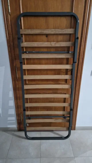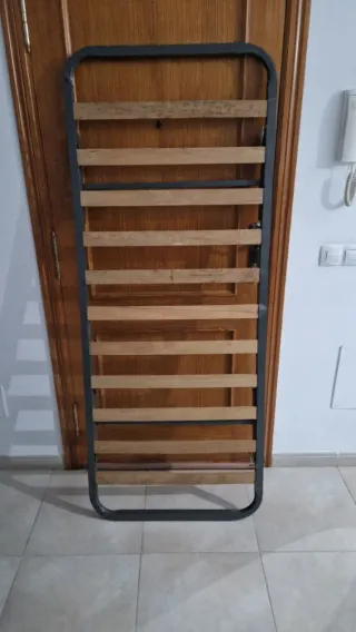 Somier de láminas con estructura metálica y detalles en madera. Patas retráctiles y con ruedas. - Medidas: 75x175 cm.