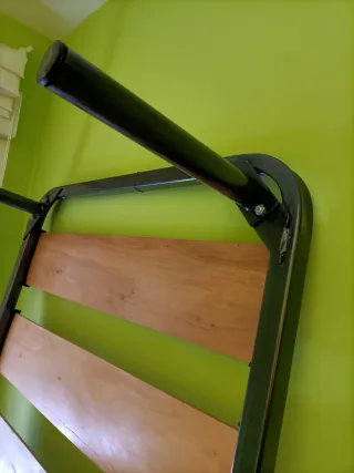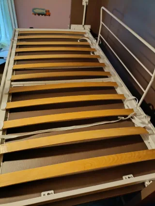 Somier de madera y metal para la parte superior de una litera. - Estructura de metal resistente. - Láminas de madera para un buen soporte. - Se entrega con la escalera y barreras protectoras laterales (no se ven en la foto). - Para colchones de 90 * 190. - Las tiras para sujetar el colchón también van incluidas. - Se incluye el mecanismo para abatir con brazos hidráulicos. El precio no es negociable, es casi un regalo. Lo pongo porque me da pena tirarlo al punto limpio estando nuevo y alguien puede darle bastantes años de uso aún. Creo que con unas patas universales se puede usar como somier independiente. Cualquier duda, escríbeme.