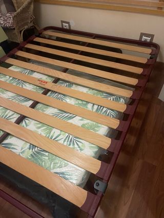 Se vende somier con láminas de madera y estructura metálica, junto con un colchón. - Somier de metal y madera. - Colchón incluido.