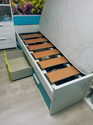 Estructura de cama juvenil, para colchon de 200x90, con un diseño moderno y funcional, ideal para optimizar el espacio. Incluye somier de laminas. Muy buen estado. - Incluye 3 cajones de gran capacidad. - Acabado en blanco y berde lima. Medidas totales largo: 2,05m ancho: 1,00m Si se quiere, se puede incluir colchon (1,90x90) 40 € mas. No se envia, se tiene que venir a recoger. Negociables.