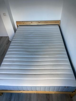 Cama de matrimonio IKEA en buen estado. Estructura de madera robusta y colchón cómodo. - Colchón VALEVÅG. Requiere un poco de limpieza por algunas manchas. Se entrega embalado para mejor transporte. - Medidas: 140x200 cm. - Base de madera NEIDEN, incluye somier LURÖY de láminas. - Tiempo de uso: 1 año 4 meses - Fecha de entrega: 26/01.