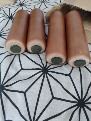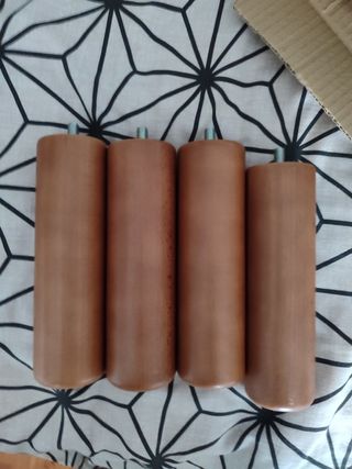 Patas de somier de madera, color haya. Son cuatro patas redondas y robustas, ideales para cualquier somier. - Se venden en conjunto. - Están nuevas, sin usar. - Vienen en un paquete. Altura 25cm Posibilidad de incluir pata central metalica de regalo (hasta fin de existencias)