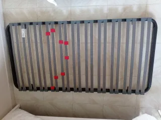 Somier de lamas de madera para cama de 105cm. Estructura metálica resistente. - Lamas de fibra de vidrio. - Con refuerzo lumbar. - Marco de metal negro. - Patas enroscables incluídas. Poco uso.