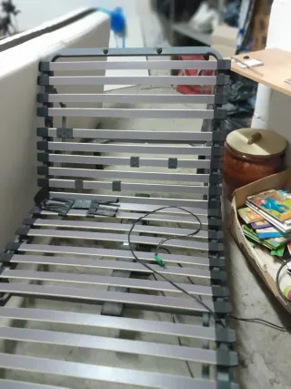 Base de cama articulada eléctrica con somier de láminas. - Estructura robusta de metal. - Láminas de madera flexibles. - Soportes de plástico para las láminas.