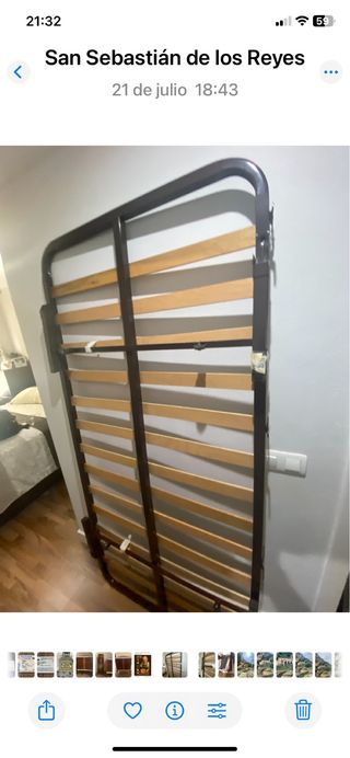 Somier de madera con patas. Lamas desmontables (ultima foto). Patas de refuerzo en la línea central para una mejor estabilidad. Prácticamente nuevo, poco uso ya que estuvo en habitación de invitados. Se vende por cambio de uso en la habitacion. Ya está desmontado para un mejor transporte. Medidas: 150x200