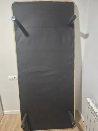 Somier de 5 patas para cama individual grande tipo cama 105x190cm. Las patas estan desmontadas, la quinta pata va en el centro para mayor estabilidad. Patas metàlicas. Su diseño combina una estructura metálica con láminas de madera. Descripcion exacta de cm en medidas del producto. - Estructura de metal resistente. - Láminas de madera para soporte. A una pata le falta el "topete" de plástico, le puse ropa para que no dañara el suelo.