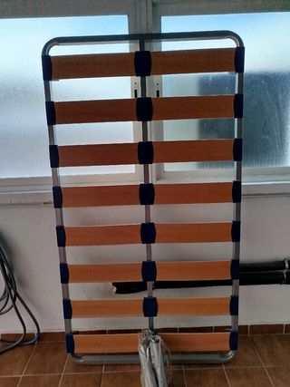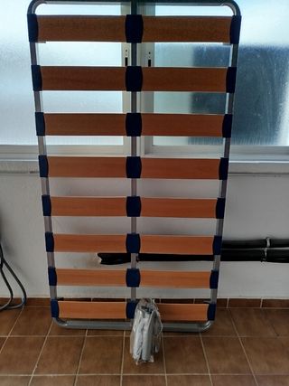 Se vende somier y colchón de medidas 90cm. - Estructura del somier metálica. - Láminas de madera. - Colchón con funda de tela.