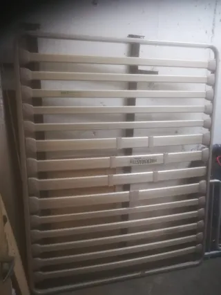 Somier de matrimonio con lamas de madera. - Medida: 135cm x190cm - Estructura metálica. - Lamas de madera como nuevas. Las lamas del somier son de madera y están perfectamente. La estructura de hierro esta algo rozada por la pared de la habitación (se ve en las fotos). Con muy poco uso, solo ha dormido una niña pequeña. También tengo un colchón de 135cm. está firme como el primer día. Lo compré en un outlet por tener algunas manchas en la tela. Tienes fotos en mi perfil El precio del lote completo son 90€. Cada pieza por separado son 60€