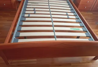 Se vende cama individual de 90 cm, lista para usar. - Estructura de madera. - Incluye somier y dos colchones. El superior es viscoelástico. Se regalan los colchones.