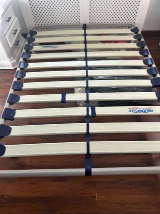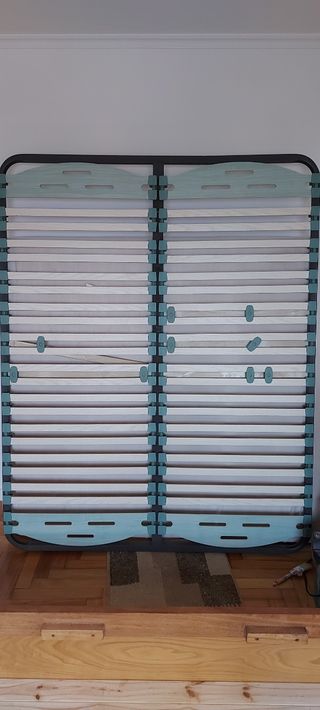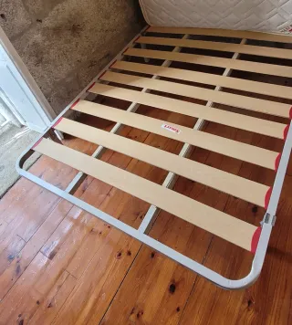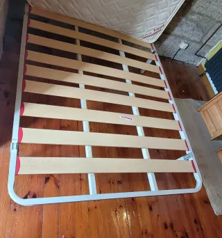 Base de cama con estructura metálica y lamas de madera. - Diseño moderno y resistente. - Fácil de integrar en cualquier dormitorio. Cincuenta euros negociables Con todos sus acesorios