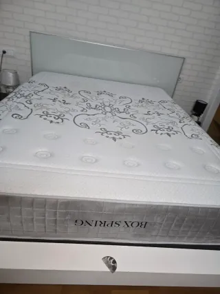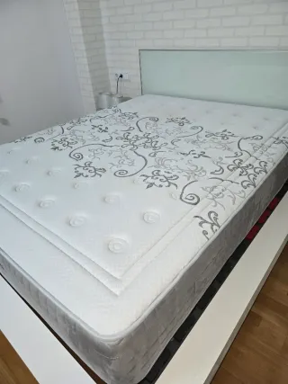 Somier "Royal Polipiel Milan" de color blanco, comprado en Dormity. Tiene 6 patas de rosca, está en perfecto estado. Lo vendo porque cambio de tamaño, también tengo un colchón de la misma medida que regalo si se compra el somier. En Dormity se vende por 380€, lo dejo por la mitad.