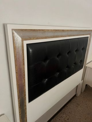 Preciosa cabecera de madera maciza para cama, en color blanco y negro. Es elegante y sofisticada. - Cabecera con diseño capitoné. - Marco de madera blanca con detalles plateados. - Tapizado en cuero sintético negro. - 2 mesitas a juego - somier incluido - la madera es de calidad.