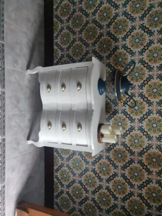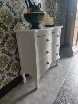 Elegante consola de estilo vintage con un diseño curvo y detalles que le dan un toque especial. - Acabado en color blanco. - Tiradores en forma de concha con acabado dorado. - Estructura de madera. Todo el mueble en madera maciza incluido traseras y fondo de cajones en madera de sapeli restaurada a color blanco Patas lira con curva medidas del producto tiene Nota : se puede sacar los vivos de color sapeli o los cajones de otro color a gusto del comprador