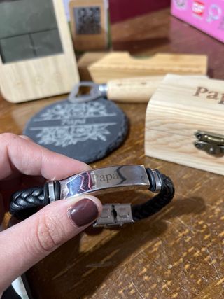Conjunto de artículos de regalo para papá. - Termómetro higrómetro - Abrebotellas de madera con grabado. - Pulsera de cuero y metal. -Nivel y regla -Posavasos pizarra -Caja papa