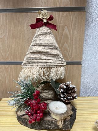 Adorno navideño con forma de árbol, ideal para dar un toque festivo a tu hogar. - Elaborado con cuerdas de tela y detalles de yute. - Base de madera rústica. - Decorado con piñas, bayas rojas y ramas nevadas.