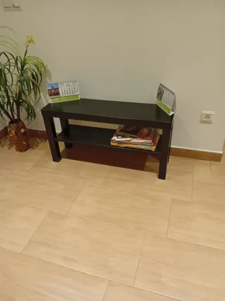Mesa de salón con un diseño moderno y elegante. - Acabado en madera clara con una franja central oscura. - Patas robustas para mayor estabilidad.