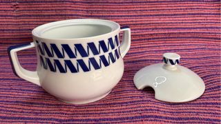 Elegante sopera de porcelana con un diseño distintivo. - Patrón de ondas en azul. - Asas laterales. - Incluye tapa con agarrador.