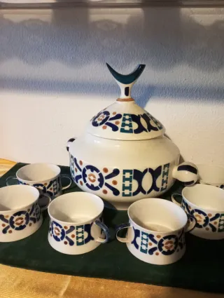 Vajilla vintage de 50 años (MARCA SARGADELOS) . - Juego de café con: - 9 servicios de taza y Platillo. - 1 Cafetera. - 1 Lechera. - 1 Azucarero (asa pegada). - 3 Tazas de repuesto. - 3 Platillos de otra línea de sargadelos. - 1 mini taza. - 2 Bandejas. - 1 Salsera. - 1 Sopera con tapa. - 1 Ensaladera. - 8 Platos de postre. - 8 Platos Hondos. - 12 Platos llanos. OPORTUNIDAD ÚNICA, VAJILLA VINTAGE Y MUY DIFICIL DE ADQUIRIR.