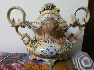 Elegante sopera de cerámica antigua, con el clasico diseño floral de la historica marca francesa. Perfecta para servir tus platos favoritos con un toque de estilo. - Diseño con flores pintadas. - Asas laterales para facilitar el transporte. - Incluye tapa a juego. Hay una pequen̈a muesca, como se observa en la foto. Ha estado muchisimos an̈os en la familia. la vendo solo por falta de espacio.