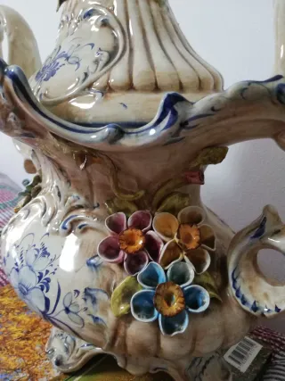 Preciosa sopera de cerámica con un diseño tradicional portugués. - Pieza decorada con motivos florales en tonos amarillos y azules. - Incluye tapa a juego. - Base o plato a juego con diseño floral. - No tiene cuchara. - Precio negociable