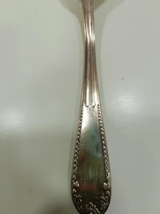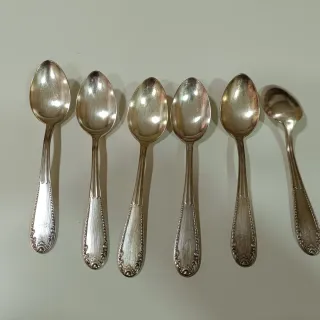 Conjunto de seis cucharas soperas de alpaca con un diseño elegante. - Material: Alpaca - Color: Plateado - Diseño decorativo en el mango