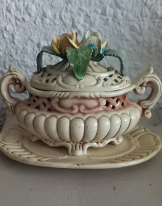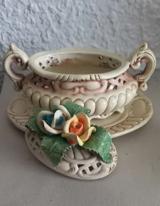 Preciosa sopera de cerámica con un diseño floral muy detallado. - Pieza decorativa con flores en relieve. - Incluye plato a juego. Recogida a cargo del comprador en Zaragoza, zona actur.