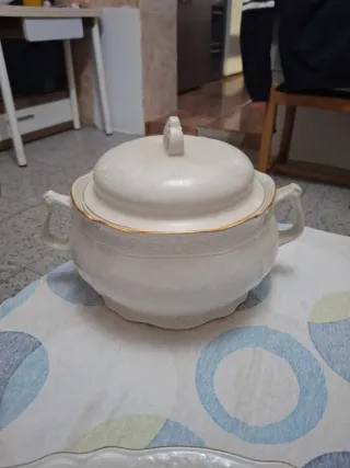 Elegante sopera de porcelana con detalles dorados. Ideal para añadir un toque vintage a tu mesa. - Incluye una bandeja a juego. - Diseño con escenas campestres pintadas a mano. - Perfecto estado de conservación.