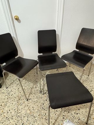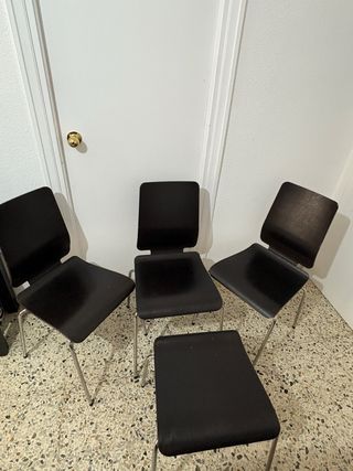 Juego de sillas de madera negras con patas metálicas apilables. Para salón, comedor o cocina. Una de ellas no tiene respaldo pero sirve como taburete. 45cm hasta el asiento de alto, 45x45 cm el asiento, 85cm con el respaldo.