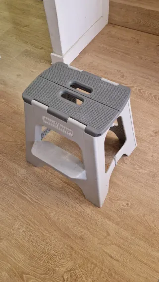 Práctico taburete plegable de dos escalones. Ideal para alcanzar lugares altos con facilidad. - Diseño plegable para fácil almacenamiento. - Superficie antideslizante para mayor seguridad. - Asas integradas para un transporte cómodo. Medidas: Cerrado: alto 50cm x ancho 43cm x prof 9cm Abierto: alto 40cm x ancho 43cm x prof 40cm Se puede retirar en Gracia, cerca a Joanic/Fontana.