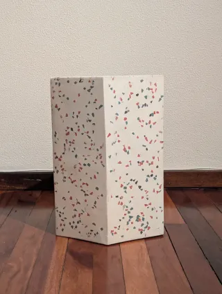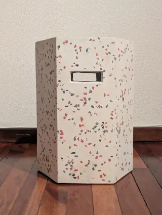 Mesa auxiliar o taburete con diseño de terrazo, perfecta para añadir un toque de color a tu hogar para la habitacion o salon. - Patrón de terrazo multicolor. - Forma hexagonal. - Asas integradas para facilitar su transporte. Dimensiones: Alto: 45 cm Ancho: 34 cm Profundo: 31 cm Tapa hexagonal, con 6 caras de 18cm de largo. Peso 14kg