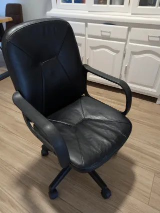 Silla de oficina con un diseño moderno y funcional. Su acabado en piel sintética le da un toque elegante. - Respaldo alto para mayor comodidad. - Brazos acolchados. - Base giratoria con ruedas para fácil movilidad. Tiene signos de desgaste en la piel pero sin rotura. La espuma está bien y es cómoda.