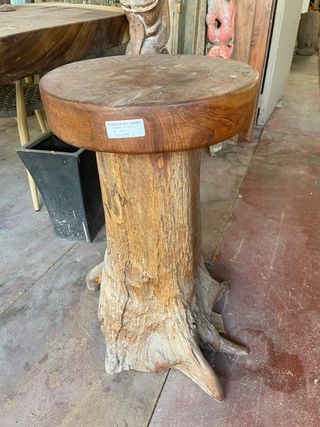 Taburete alto con un diseño orgánico y único, creado a partir de una raíz de teca. - Base robusta y natural. - Superficie redonda y lisa.