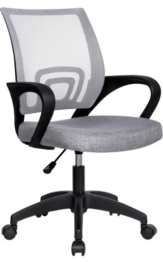 Silla de oficina con un diseño moderno y cómodo. - Asiento y respaldo tapizados en tela. - Base de plástico con ruedas para fácil movilidad. Funcionamiento perfecto y las ruedas también.