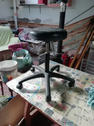 Taburete giratorio con asiento acolchado. - Base de cinco patas con ruedas. - Altura ajustable.