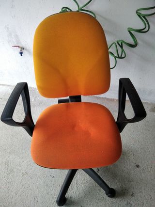 Se vende silla de oficina giratoria. Muy resistente y robusta. Es cómoda y está en buen estado. Se pueden apreciar evidentes signos de desgaste en la tapiceria por el uso. - Asiento y respaldo de tela reclinable y ajustable en altura. - Estructura metálica. - Cinco ruedas para facilitar el movimiento.