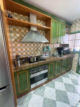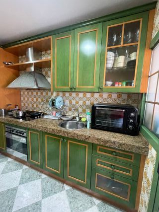 Conjunto de muebles de cocina en llamativos tonos azules y blancos. - Armarios superiores con puertas de cristal. - Base de muebles con cajones y puertas. - Campana extractora blanca. - Mesa plegable compañera y taburetes. - Se regala encimera de granito. Se incluyen frigorifico y horno. El comprador se encargará del desmontaje y traslado.