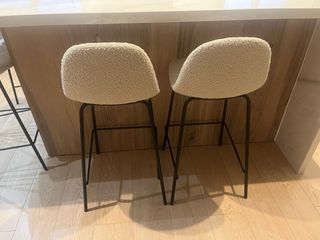 Conjunto de dos taburetes de cocina de la marca Maison du Monde. Su diseño moderno y confortable los hace ideales para cualquier hogar. - Tapicería de tela en color beige. - Patas de metal negro. Tengo juego de 4