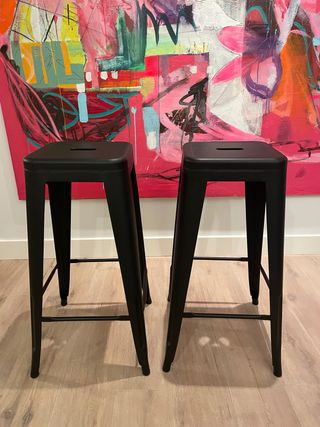 Dos taburetes altos negros estilo bar. • Altura aproximada: 100 cm • Estructura resistente • Reposapiés metálico Ideales para barra de cocina o isla. Se venden juntos. Buen estado.