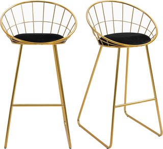 Conjunto de 2 Taburetes Altos, Taburetes de Cocina con Respaldo y Reposapiés para Salón o Cocina Estilo Moderno, Cojín de Terciopelo y Estructura de Metal, 52.5X47X97Cm, Negro y Oro