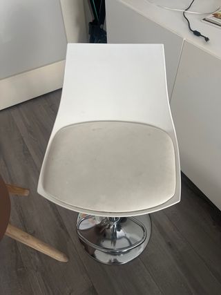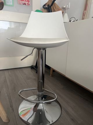 Taburete alto con un diseño moderno y funcional. Su asiento giratorio ofrece comodidad. - Asiento de plástico blanco. - Base y columna de metal plateado. - Altura regulable.