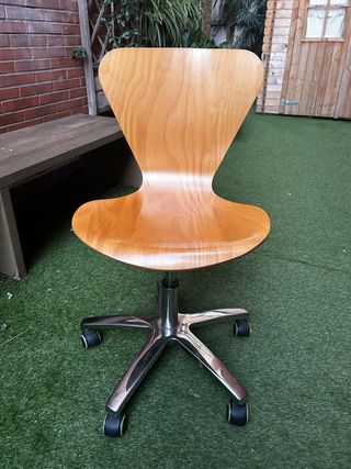 Silla de despacho con un diseño icónico y elegante. - Asiento y respaldo moldeados en madera contrachapada. - Base giratoria cromada con ruedas. - Altura ajustable.