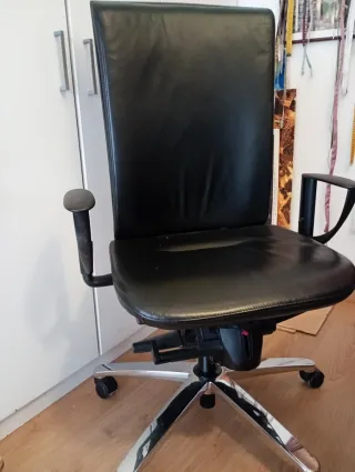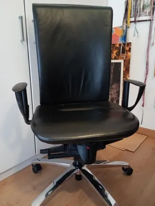 Silla de oficina de color negro con: - Base giratoria con ruedas - Altura regulable - Respaldo alto - Fácil limpieza con paño húmedo Pequeña rajita en la piel del asiento como se ve en la foto, por lo demás perfecta.