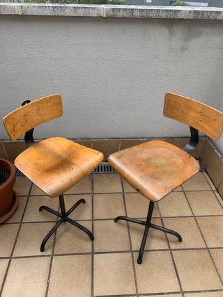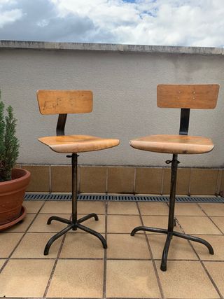 Pareja taburetes industriales giratorios, regulables en altura y con respaldo basculante. Madera y metal. Precio unidad.