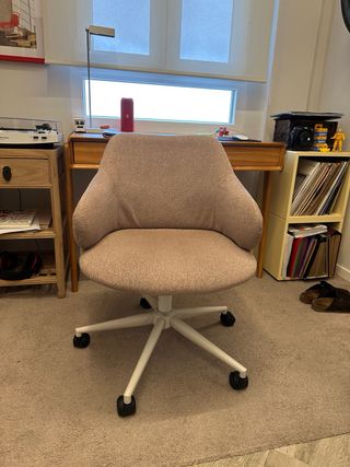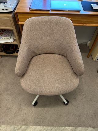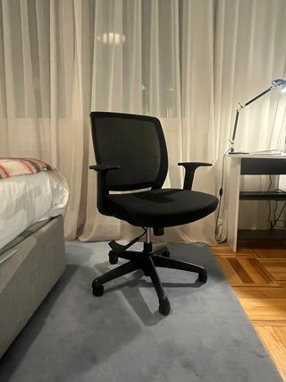 Silla de oficina giratoria de Ikea. Su diseño ergonómico la hace cómoda para largas jornadas. Aunque esta ya tiene mucho uso. - Respaldo de malla transpirable. - Asiento acolchado. - Base con ruedas para fácil movilidad.
