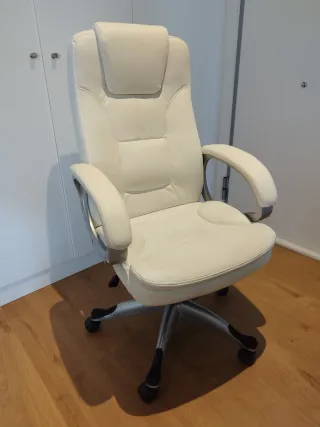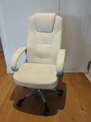 Preciosa silla de oficina en color blanco roto con estructura metálica. Es giratoria, regulable en altura, ergonómica y con ruedas. Ideal para trabajar desde casa o en la oficina. Se encuentra en buen estado (adjunto fotos del desgaste por uso) Cómoda y elegante. Se escuchan ofertas