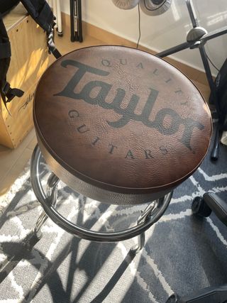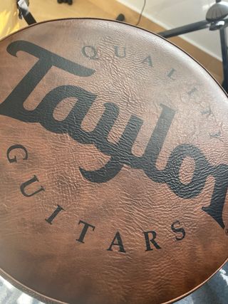 Preciosa banqueta de bar con el logo de Taylor Asiento giratorio acolchado Acabado: Vinilo marrón jaspeado mate con el logotipo de Taylor en negro Altura: 610 mm Acolchado con un diámetro de 350 mm Profundidad: 80 mm Peso: 2,0 kg