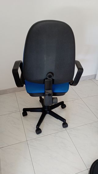 Silla de oficina con un diseño ergonómico y funcional. - Asiento y respaldo tapizados en tela azul. - Base de plástico con ruedas para facilitar el movimiento. - Reposabrazos de plástico negro.