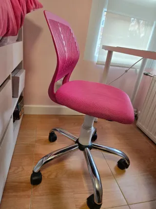 Preciosa silla de escritorio infantil, ideal para estudiar. Es giratoria y tiene ruedas. En nuy buen estado - Respaldo ergonómico y cómodo. - Asiento de tela rosa. - Base y patas blancas.